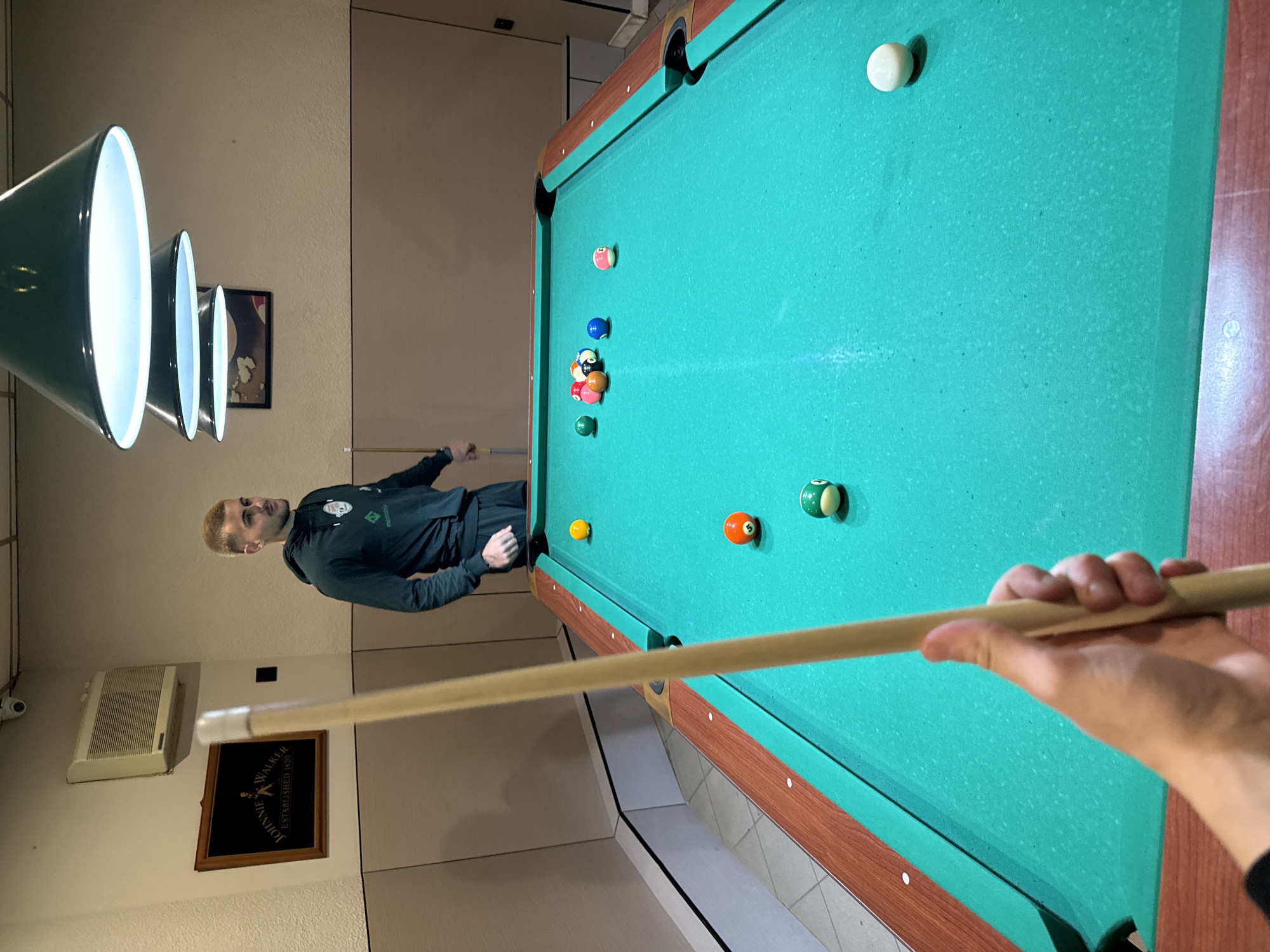 person playing pool in a room with beige walls. Overhead are three green lamps. A person in a green tracksuit stands beside the pool table. There are various billiard balls scattered on the green felt of the pool table. A pool cue is held in the foreground. A Johnnie Walker sign and an air conditioning unit are visible on the wall. It is not possible to determine the location is Berkovitsa, Bulgaria from the image.