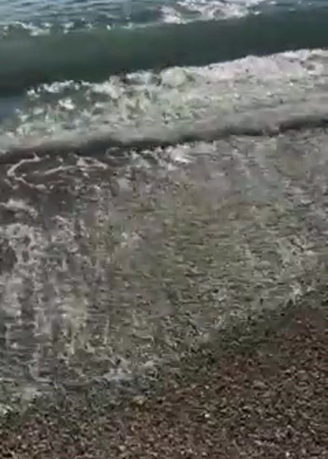 waves lapping on a shingle beach. The sea is a murky grey-blue, sparkling in the sunlight. The waves are small and foamy as they break on the shore. The beach is covered in dark grey pebbles. No people or other objects are visible.