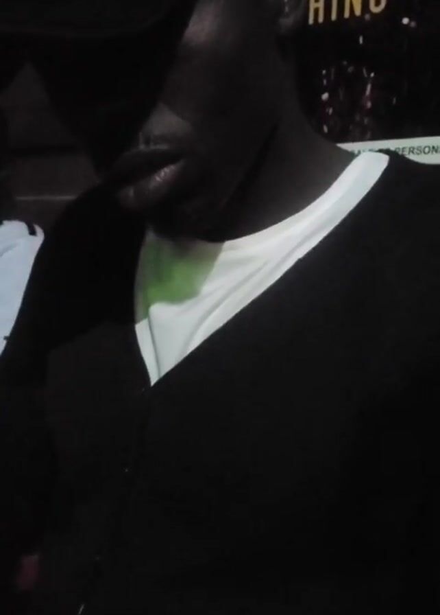 A person wearing a black baseball cap, a black shirt, and a white undershirt is seen from the chest up. The person appears to be in a dimly lit area. A sign or poster is visible in the background with the letters "S" and "ING" partially visible. The person has their arms crossed and looks down. Another person's shoulder is visible on the left.