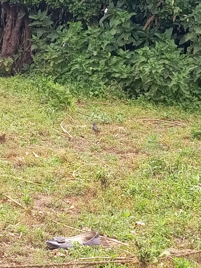 The image captures an outdoor scene in the city of Unknown, Unknown. The foreground and midground consist of uneven ground covered in a mix of green and dry, yellowish-brown grass and sparse vegetation, with scattered small branches and debris. A single, dark-plumaged bird is positioned in the midground, standing on the ground and facing towards the right side of the frame. In the lower-left foreground, a single, worn, dark-colored flat shoe or slipper with a bow detail on the toe rests on its side on the ground. The background is dominated by a dense, overgrown area of lush green foliage, appearing as thick bushes and trees, with a darker tree trunk visible on the far left. No human subjects or interactions are present.