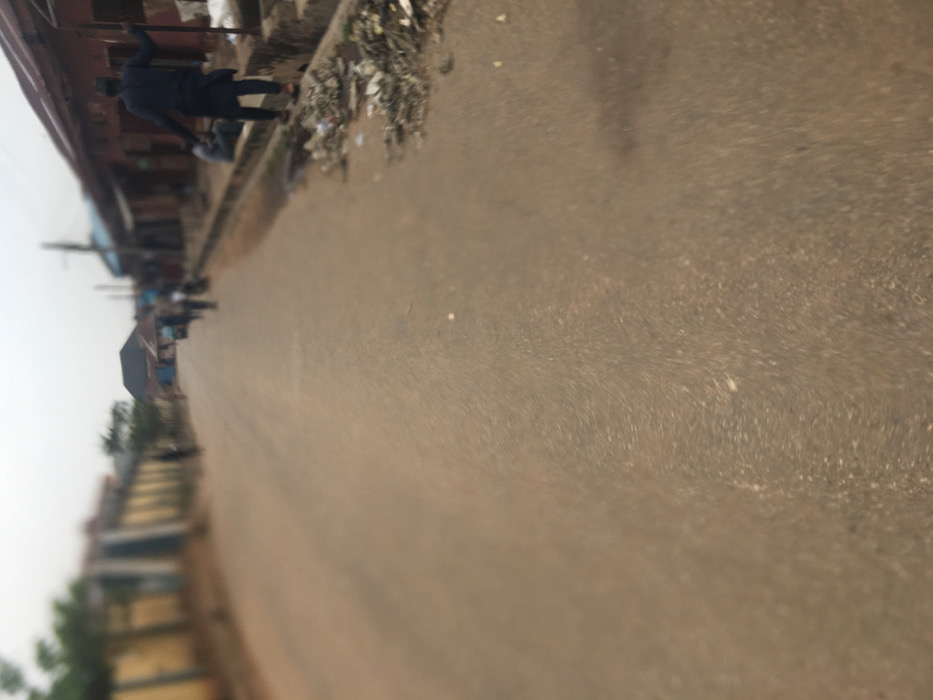 The image depicts a street scene in Dadi Riba, Nigeria, captured from a low perspective looking down the length of the road. The asphalt road occupies the majority of the foreground and midground, appearing dusty and worn. On the immediate right side of the road, a concrete drainage ditch or gutter runs parallel to a row of single-story structures. This ditch contains scattered refuse, including plastic bags and other debris. A male figure, dressed in dark clothing (possibly a long tunic and trousers), stands in the right mid-foreground. His back is primarily to the camera, and he is positioned with one foot on the street level and the other on the edge of the raised concrete structure bordering the ditch, appearing to lean against an entrance or wall opening of one of the buildings. The buildings on the right side of the street feature reddish-brown corrugated metal roofs and weathered facades, suggesting commercial or residential use. A utility pole is visible among these structures. On the left side of the street, a light-colored, possibly yellow or beige, walled fence runs parallel to the road, with indistinct green foliage visible above and behind it. Further down the street in the midground, multiple blurry human figures are discernible, walking or standing, indicating pedestrian activity. The street recedes into the background where more buildings are visible under an overcast or hazy sky. The entire image exhibits significant blur, particularly in the foreground and background, limiting the clarity of fine details.