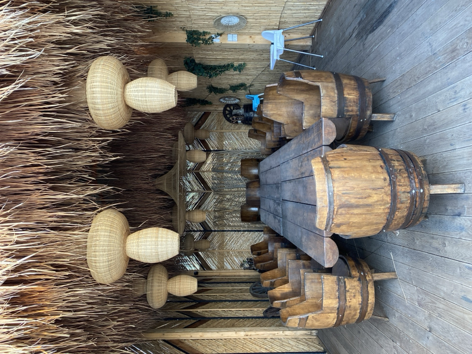 The image showcases an interior with rustic aesthetics. A long wooden table, flanked by barrel-shaped seats, sits on a wooden floor. Above, a ceiling is constructed with straw and bamboo elements. Uniquely shaped woven lamps hang down, adding to the ambiance. A child's high chair is also present, positioned away from the main seating area.