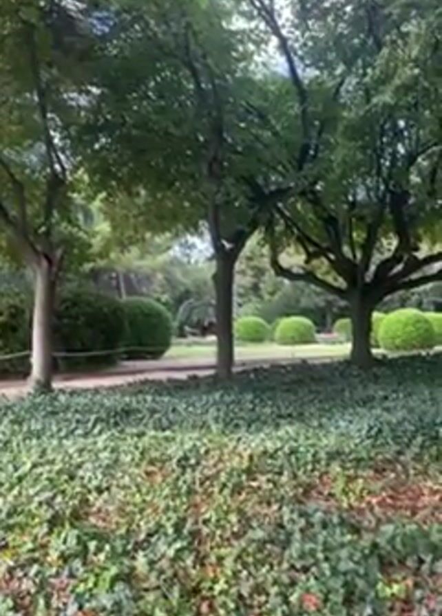 garden scene with a pathway winding through neatly trimmed, round bushes. Tall, leafy trees provide shade over a ground cover of green ivy mixed with some fallen leaves. The light is diffuse, suggesting an overcast day. There is no visible human activity.