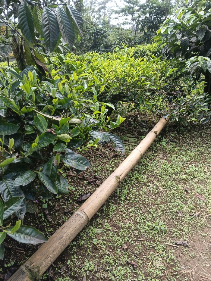 Lush green vegetation dominates the scene, featuring coffee and tea bushes. A thick bamboo stalk rests on the ground amidst the greenery. The area appears to be a cultivated field, likely for tea and coffee production. Sunlight filters through the leaves, creating a soft, natural ambiance. The ground is covered with small plants and scattered debris.