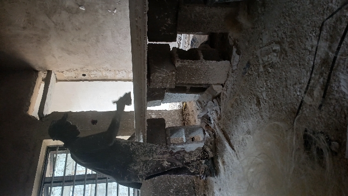 An interior image depicts a construction or renovation site in the city of Unknown, Unknown. A single individual, an adult male, stands in the left foreground, largely silhouetted against a gridded window. He wears a cap, a dark shirt, and dark pants, all heavily coated with white particulate matter. The individual is actively engaged in applying a tool, possibly a trowel or float, to a long, white, rectangular object. This object rests horizontally on two improvised supports fashioned from stacked hollow concrete blocks, which are also dust-covered. The floor is an unpaved surface, thickly covered in white dust, debris, and small aggregate particles. Scattered broken fragments of concrete or plaster lie near the base of the block supports. In the bottom left foreground, a tangled mass of light-colored fibrous material and a dark cable are visible. A doorway or open archway is present in the background, revealing a lighter space beyond. The walls appear to be unfinished concrete or plaster surfaces.