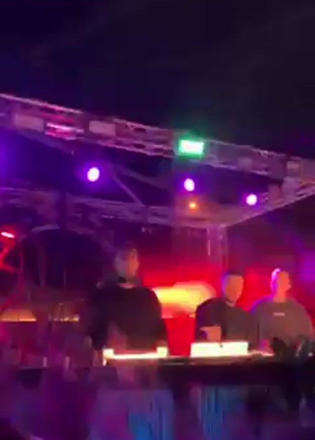 Three people are behind a table, illuminated by bright lighting on a stage. The lighting is a mix of green, purple, and red. Above the table is a metal truss, also illuminated with various lights. The people appear to be adjusting equipment on the table. The camera is positioned below the stage, angled upwards, capturing the silhouette of the crowd in the foreground.