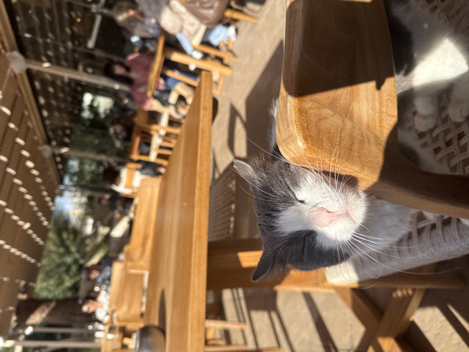 - "A grey and white domestic cat rests in the foreground, its head on the top rail of a light-colored wooden chair, eyes closed and face illuminated by direct sunlight" by FM-DrUow1, licensed under CC BY 4.0