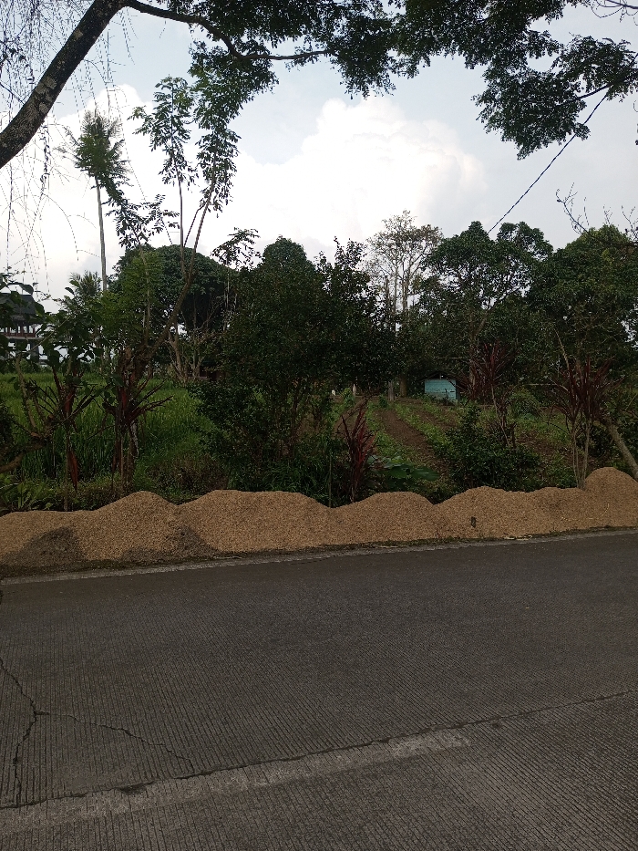 This image displays an outdoor scene in Sandamal Eliya, Sri Lanka. The foreground is occupied by a dark gray asphalt road, exhibiting horizontal grooving and minor cracks. Immediately beyond the road, a continuous, undulating mound of light brown, granular material, consistent with rice husks, extends horizontally across the frame. Behind this mound, a vegetated landscape ascends, densely covered with various trees and green plants. A multi-story building with a dark roof is partially visible on the far left, obscured by foliage. In the mid-ground, a cultivated field with discernible rows of crops is present, behind which a small, light blue wooden shack or shed is situated, partially hidden by surrounding greenery. The background shows a cloudy sky. The upper periphery of the image is framed by dark tree branches laden with green leaves, with a single bare branch visible on the far left. No individuals are visible in the scene.