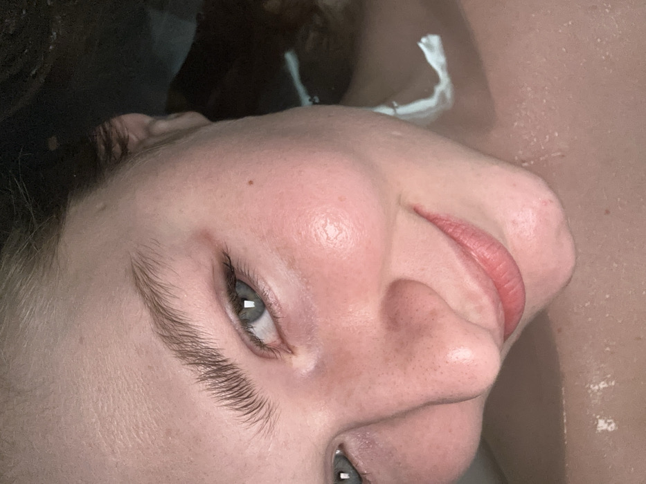 A close-up captures a woman's face, likely in water, viewed at an angle. Her left eye is visible, a pale blue-gray, with light reflecting in the pupil. Her eyebrows are thick and natural. The skin appears dewy and smooth, with a slight rosy tint. Her lips are full, tinted a natural pink. The lighting is soft and diffuse, giving the image a gentle and intimate feel.