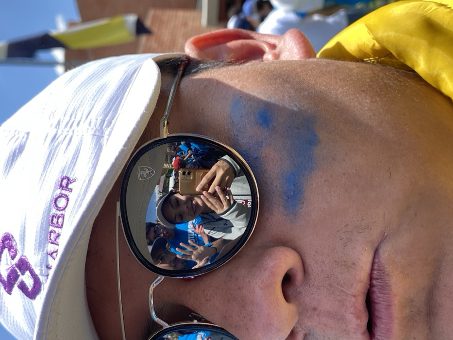 The image depicts an outdoor, close-up scene in Achocalla, Bolivia, focusing on the right side of an individual's face, specifically their nose, mouth, right cheek, and ear. The individual wears a white baseball cap with purple "ARBOR" embroidery and round, gold-rimmed mirrored sunglasses, the right lens featuring a small Ferrari logo. Blue face paint is smeared on the right cheek. A yellow garment, possibly a jacket collar, is visible on the right side of the frame. The mirrored right sunglass lens reflects a separate scene: a young woman in the foreground, wearing a grey hoodie and a light-colored cap, taking a selfie with a gold-colored smartphone held in both hands. She is smiling. To her immediate left, a young man in a blue t-shirt and a dark baseball cap is visible, waving with his right hand. Further back, another young man in a blue t-shirt and glasses is partially visible. The reflected background indicates a sunny, crowded outdoor environment with numerous people, many wearing blue attire, and a brick building. In the background behind the primary subject, a segment of a yellow and blue flag is visible against a clear blue sky. Blurred figures, some in blue and white clothing, are also discernible, suggesting an ongoing public event or gathering.