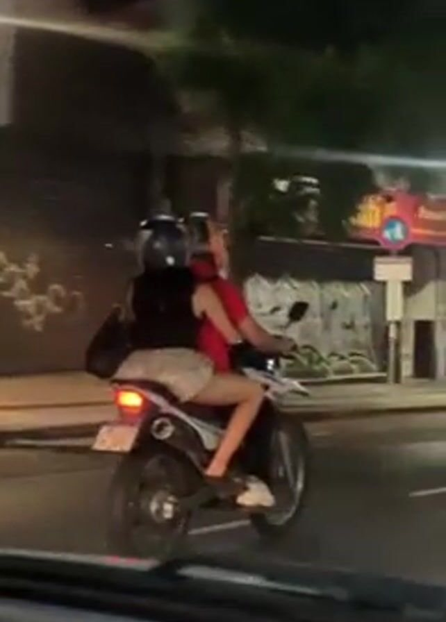 A car passenger films two people riding a motorcycle down a city street at night. The motorcycle is white and black and has a license plate. The driver wears a red shirt, light shorts, and white sneakers. The passenger behind the driver wears dark clothing, a backpack, and white sneakers. Both people wear helmets. The motorcycle drives past buildings including a Nike Outlet, a bakery, and other storefronts. Trees line the street, and street lights illuminate the scene. A red light is visible to the right.