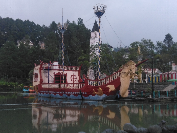 - "An ornate, stationary amusement park boat, designed to resemble a galleon, sits on a placid body of water under an overcast sky" by FM-AWsTN2, licensed under CC BY 4.0