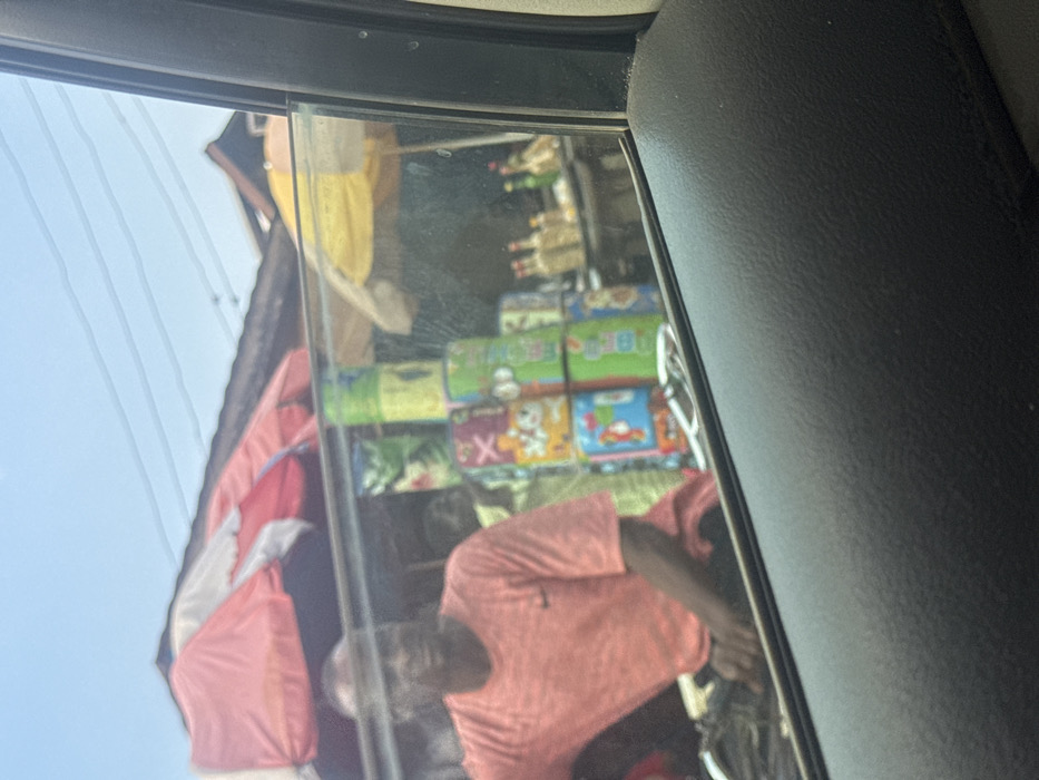 The image depicts a roadside market scene in Ekwulobia, Nigeria, viewed from inside a vehicle through a soiled window