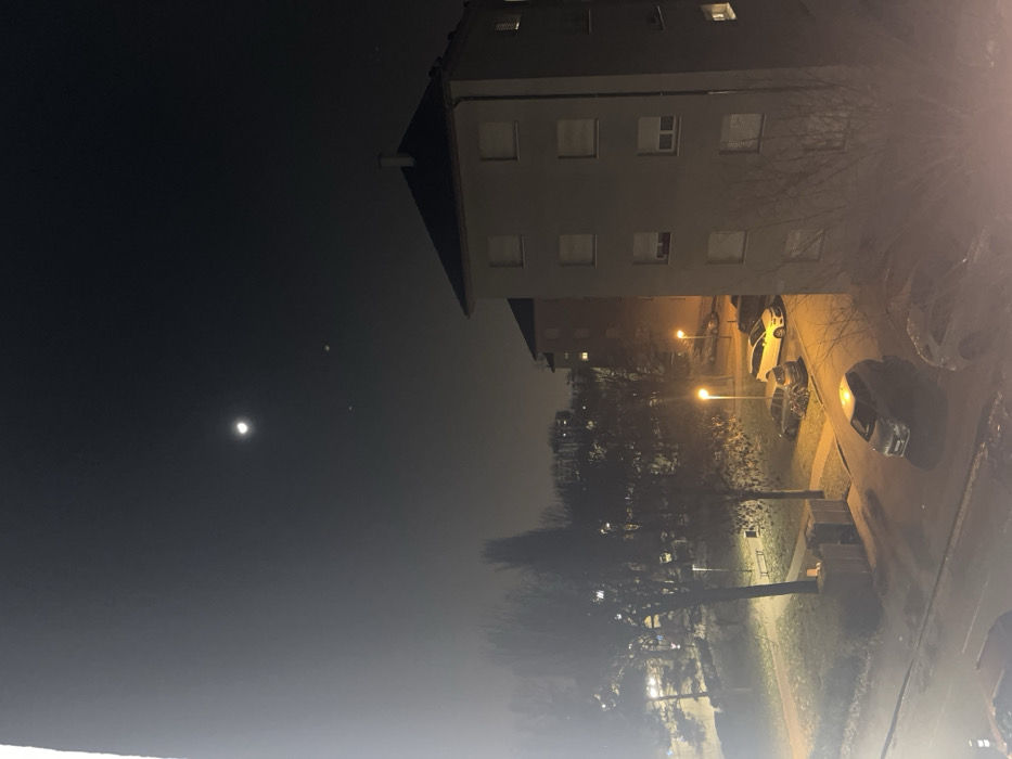 Night view of an urban landscape. A tall building with rows of windows dominates the upper right. To the left, a dark sky reveals a moon and two fainter celestial objects. Below the building, streetlights illuminate a parking area with cars, bare trees, and a grassy area with benches. The image is taken from an elevated perspective.