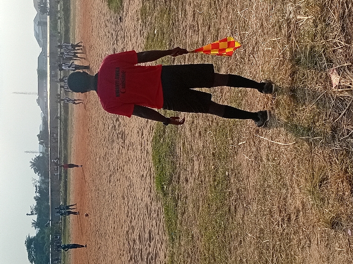 A person in a red shirt and black shorts holds a yellow and red checkered flag on a dirt field. Behind them, a line of people stands along the edge of the field. In the distance, other people are playing what appears to be soccer. The surrounding area consists of dry grass and sparse vegetation, with buildings visible in the far background.