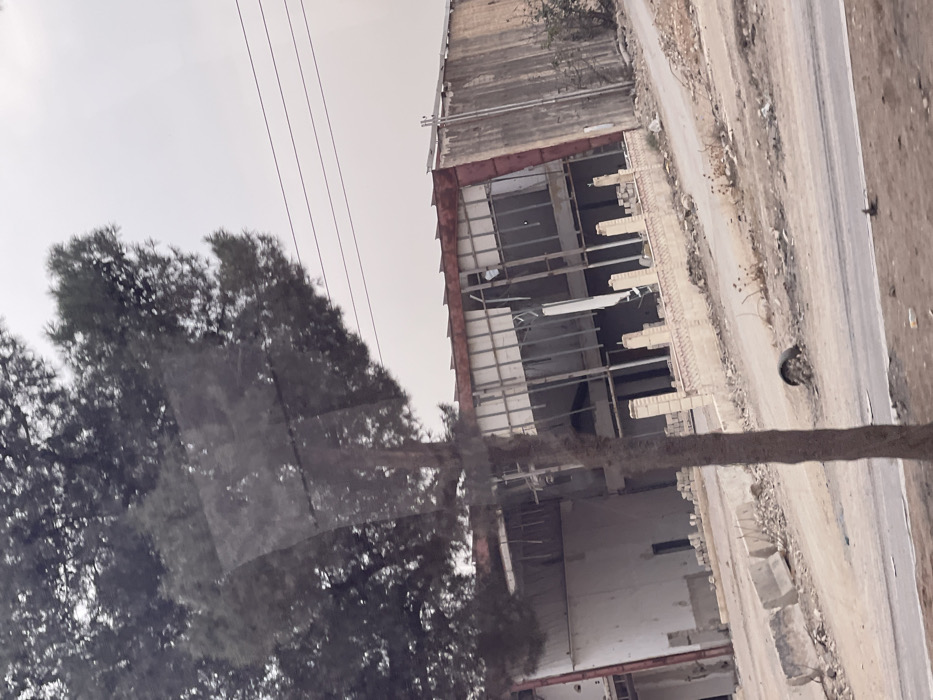 The image displays an outdoor scene in Harasta, Syria, under an overcast sky. A large, multi-story structure, consistent with a damaged industrial or commercial building, dominates the right and central background. The building's front facade is largely open, revealing a skeletal framework of vertical and horizontal supports where windows or panels once were, indicative of extensive damage or demolition. The roof exhibits red-brown corrugated metal or beams. A partial, light-colored brick wall with spaced vertical pillars extends along the front base of the building, appearing damaged or incomplete. The right side of the structure features a solid, weathered wall, possibly of concrete or corrugated material. In the left and central foreground, a tall, coniferous tree with a thick trunk stands, its dark green foliage filling the upper-left quadrant. The ground in the foreground and around the building is unpaved, consisting of dirt and gravel with scattered dry vegetation. A dark asphalt road or paved surface runs diagonally across the lower-middle portion of the frame. Debris includes several light-grey concrete blocks positioned to the left of the building's base and a black tire lying on its side in the mid-right foreground. Three parallel power lines traverse the upper-right section of the frame against the grey sky. No individuals or animals are visible.