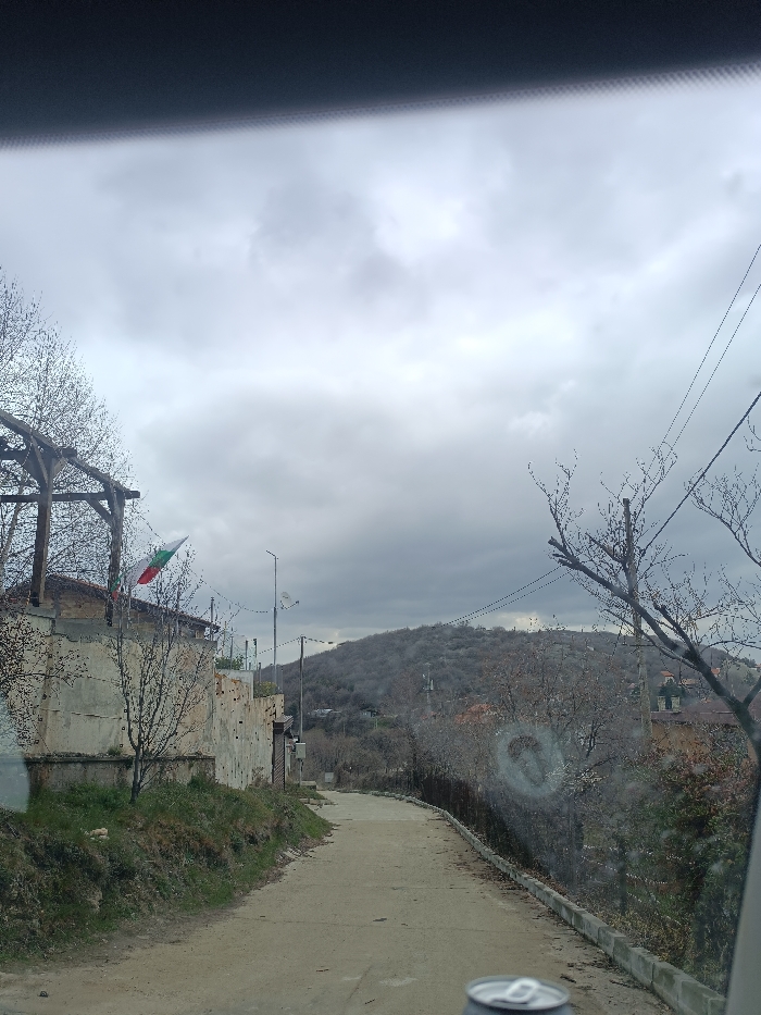 The image depicts a semi-rural street scene in Yavrovo, Bulgaria, viewed from inside a vehicle. A paved road, light grey in color, ascends uphill and curves slightly to the left. On the immediate left, a light-colored building with a visible portion of a brown tiled roof features a wooden pergola structure above it. A small Bulgarian flag (white, green, red horizontal stripes) is affixed to the building's exterior wall. Bare deciduous trees and shrubs are present on a grassy bank adjacent to the building and along the roadside. On the right side of the road, a low concrete curb borders a steep embankment covered with dense, bare vegetation. Utility poles and overhead wires traverse the scene, with a street light pole visible further up the road on the left. The background consists of a prominent hill densely covered with bare trees, indicating a colder season. The sky is uniformly overcast. The top edge of a vehicle's dashboard or windshield is visible at the top of the frame, and the top of a silver beverage can, blurred, is visible at the bottom center, suggesting it is in the immediate foreground. No individuals are present.