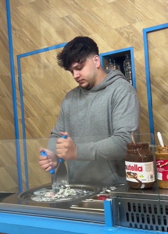 A young man is working at a food counter. He is standing in front of a flat, circular, metal surface, and is using two metal scrapers to chop and mix the contents of the surface. Behind him are three open jars of spreads, labeled "Nutella," "B," and a green spread. To the right are rows of white tubs with colorful labels. The counter is trimmed in bright blue. A framed picture of a panda in a suit hangs on the wall, along with a silver YouTube award plaque. The walls have a faux woodgrain pattern.
