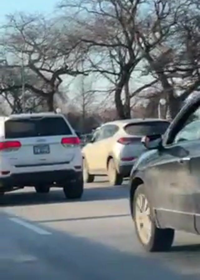 white Jeep Grand Cherokee and a light grey Hyundai Tucson SUV stopped side-by-side in traffic on a street with bare trees on either side. Behind the vehicles, flashing blue lights indicate the presence of a police car. A person is standing between the two vehicles talking to the driver of the Tucson. The camera is positioned in a third vehicle, slightly behind the other two. The sky is bright blue.