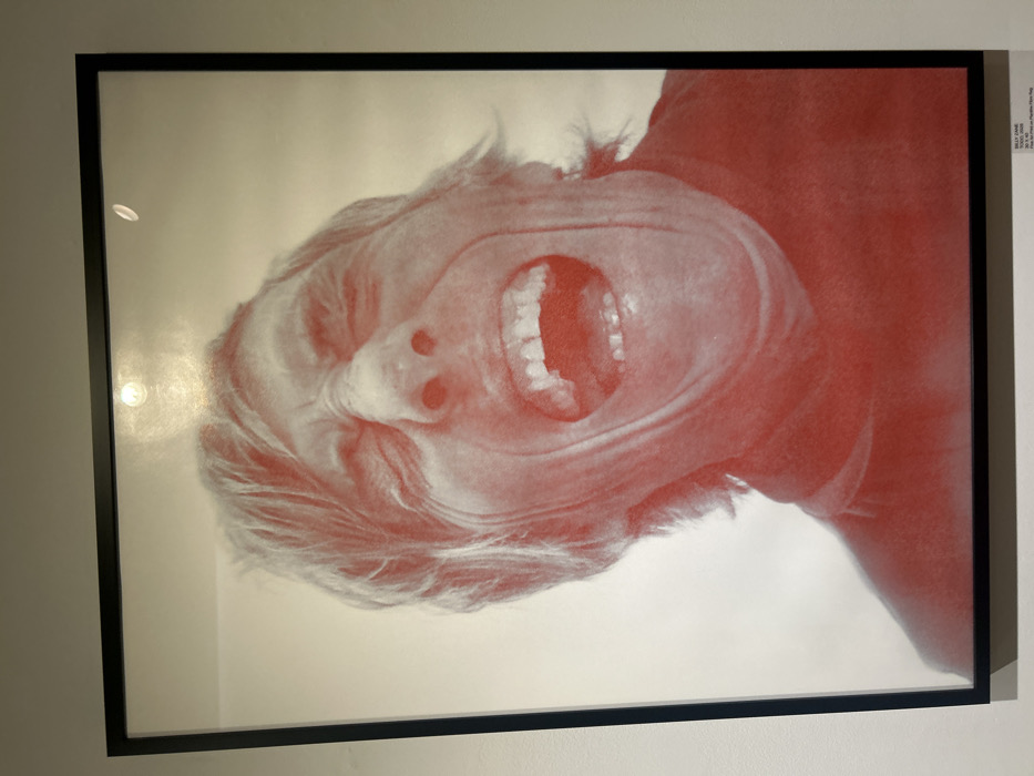 A framed portrait dominates the image, depicting a face distorted in a scream or yell. The person's head is tilted back, revealing an open mouth and strained facial muscles. The print is predominantly red, creating a stark and intense visual impact. The frame is simple and black, contrasting with the artwork's vivid color. Text is visible on the right side of the frame, likely providing information about the artwork or artist.