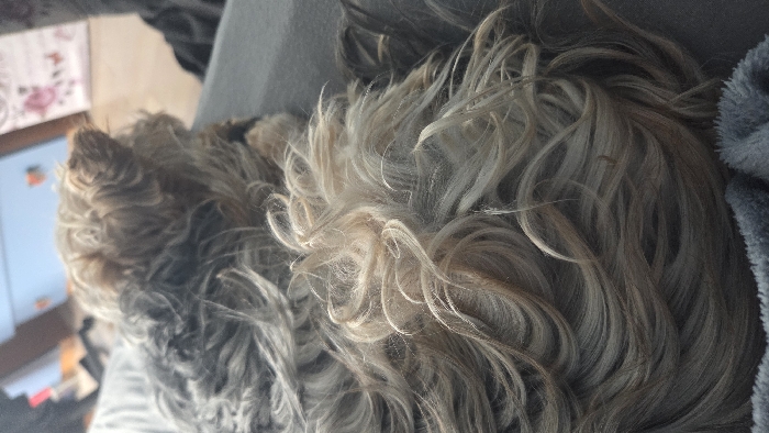 - "The image displays a small dog, consistent with a Yorkshire Terrier, resting on a grey, soft textile surface that partially covers an unseen individual" by FM-Mbqt72, licensed under CC BY 4.0