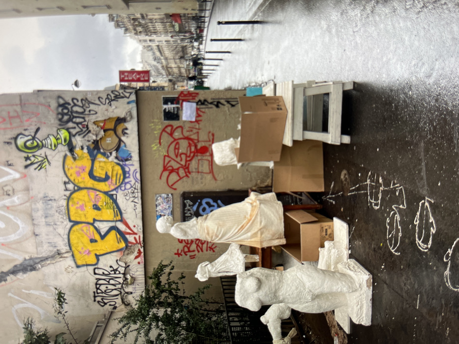 The image depicts an urban street scene in Ivry-sur-Seine, France, on an overcast day with wet pavement, indicating recent rain. In the foreground, a collection of white, rough-textured sculptures, likely made of plaster or papier-mâché, is displayed on a dark, wet sidewalk. The primary subjects are these sculptures: 1. On the left, a prominent, large, white female torso statue stands on a rectangular base. 2. Behind and to the right of the torso, several additional white, human-like figures are present. One tall, draped figure, partially covered in a light-colored fabric, stands on a wooden table. Another smaller, dress-like figure is visible behind it on a separate surface. 3. Further right, two white head or bust forms are placed, one on a cardboard box and another on a white wooden stool. 4. Multiple open brown cardboard boxes are scattered around the sculptures and supporting furniture. White chalk or paint outlines of stylized fish or similar shapes are visible on the wet pavement leading away from the display. The background consists of two sections of a building wall. The lower section, behind the sculptures, is tan, heavily covered with red and black graffiti tags, including a distinct red cartoonish face. The upper wall section is lighter, possibly off-white, extensively covered with yellow, black, and green graffiti, prominently featuring the large yellow letters "BDG." A small green bush is visible on the far left. To the right, a narrow, wet street extends into the distance, lined with dark bollards. Buildings with multiple windows and classical architectural elements line both sides of the street. A vertical red sign with the word "THEATRE" is visible on a building further down the right side of the street. Indistinct figures of pedestrians are visible in the distance along the street.