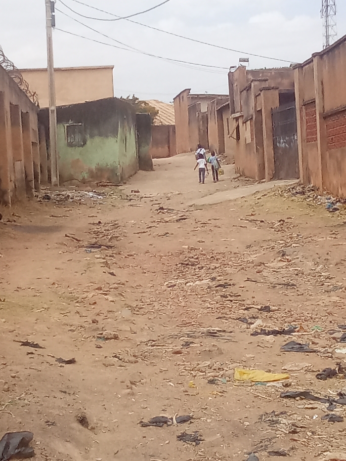 The image displays an unpaved, uphill dirt road in a residential area of Jos, Nigeria. The road surface is heavily littered with various debris, including plastic bags and refuse. Three individuals, appearing to be children or young adults, are observed walking uphill away from the camera. Buildings line both sides of the road; on the left, structures include a utility pole, a weathered, two-toned green and dark-colored building with a barred window, and other unpainted, worn buildings, some with razor wire on their perimeter walls. On the right, a continuous row of similar unpainted, weathered brown buildings, characteristic of concrete or mud-brick construction, feature a dark metal gate and areas of exposed red brickwork. A distant metallic tower is visible above the buildings on the far right. The sky is overcast.