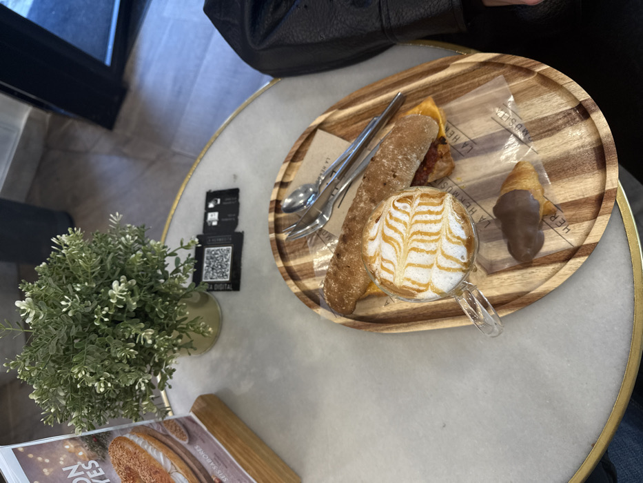 A high-angle shot captures a tabletop scene at La Hermosa Bake House, located in Madrid, Spain