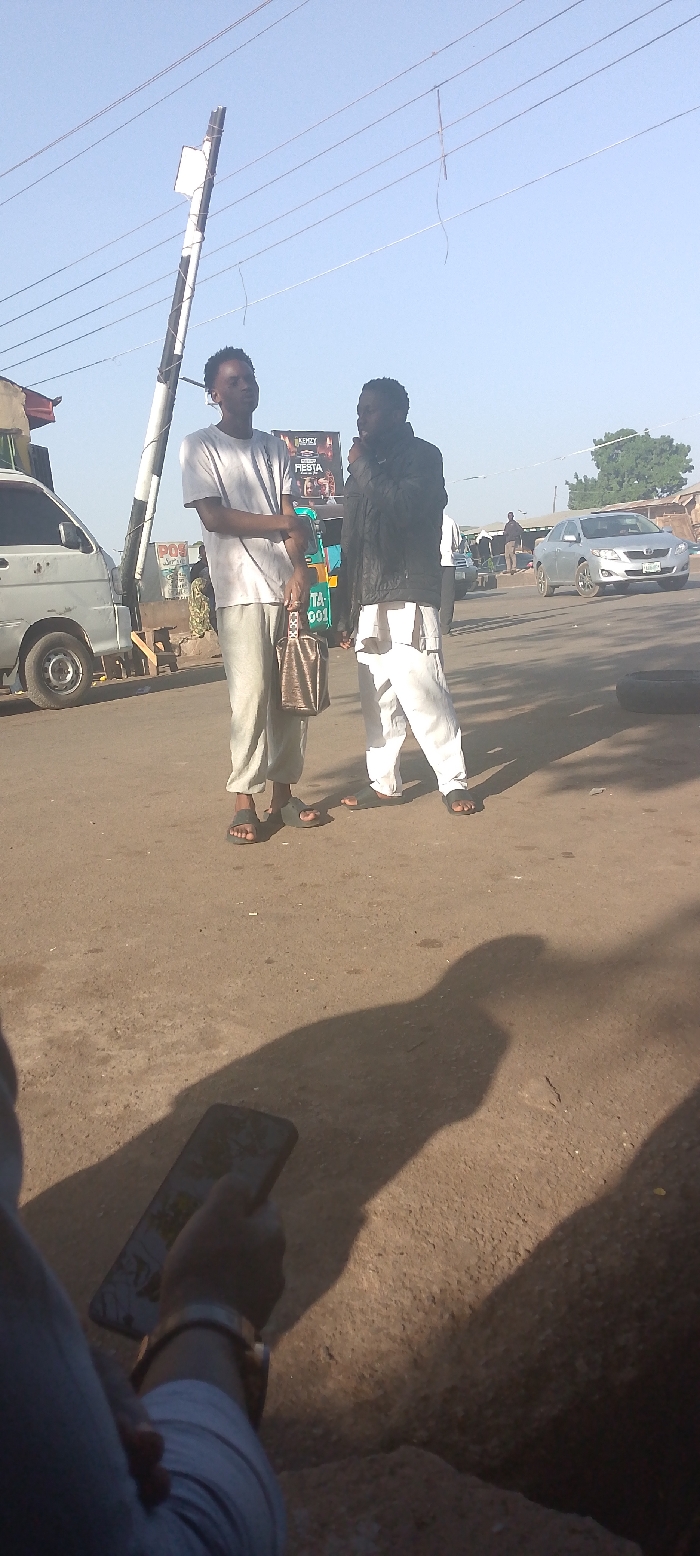 Two men stand on a street corner, engaged in conversation. One wears a white t-shirt and light pants, holding a shiny purse. The other is dressed in a black jacket over a white shirt and white pants. Behind them, a silver van and car are visible, along with other pedestrians. The sky is clear and bright. The shadow of the photographer, including a hand holding a cell phone, is in the foreground.