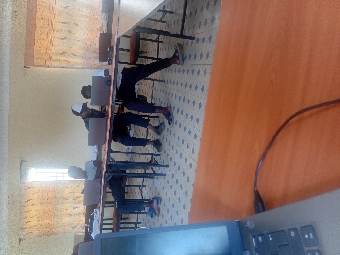 The image depicts an indoor scene in Kakamega, Kenya, likely a classroom or computer training room
