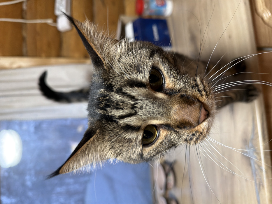 A tabby cat looks upward, its face close to the camera. The cat has a brown and black striped coat, pointed ears with tufts of hair, and long white whiskers. Its eyes are green. The background includes a wooden surface, a blue cloth, and blurry objects. The cat's tail is partially visible, curled behind its body.