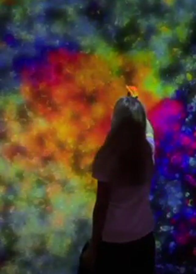 A young woman with long brown hair is interacting with an interactive art installation. She is wearing a light pink t-shirt and black pants. She is facing a large screen that displays an ever-changing pattern of bright, multicolored lights. The lights resemble splattered paint or vibrant, blurred shapes. She reaches out and touches the screen with her hand. As she does, the patterns on the screen react to her touch. The environment appears to be a dark, enclosed space designed to enhance the visual impact of the artwork.