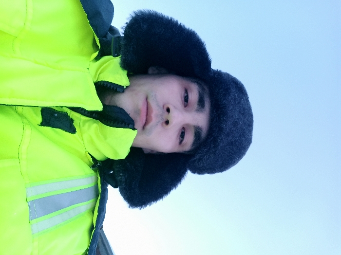 A single individual, a light-skinned adult male, is depicted in a close-up, chest-up portrait, looking directly at the camera. The man has dark hair, dark eyes, and visible stubble on his face. He is wearing a dark, possibly black, fur-lined ushanka-style hat with ear flaps down. His attire includes a neon yellow high-visibility jacket featuring a black zippered collar. The jacket displays two vertical silver-colored reflective stripes on the right shoulder area and a small dark, rectangular patch on the left chest. The background consists predominantly of a clear, pale blue sky, with a faint, dark architectural edge visible in the upper right corner. The scene is located in the city of Yukhta, Russia.