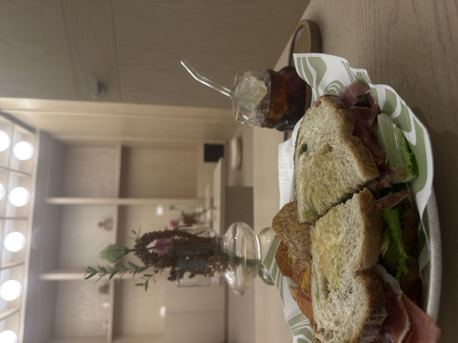 The scene depicts a meal served on a light wooden table within a cafe or restaurant setting in Puebla City, Mexico. In the foreground, a sandwich, cut in half, rests on a white plate lined with green and white patterned paper. The sandwich features thick-cut bread, likely artisan, with visible green pesto or herb spread on the interior of the top slices. The filling consists of thinly sliced cured meat (appears to be prosciutto or ham) and green leaf lettuce. Adjacent to the sandwich are assorted root vegetable chips. To the right, a textured clear glass contains a dark iced beverage with a lemon wedge and a clear glass straw. In the midground, a clear, two-tiered glass vase holds a sparse arrangement of dried brown floral elements and fresh green foliage with a prominent light green bud. The background reveals a minimalist interior with light wood-paneled walls and integrated shelving units. The ceiling features multiple circular, recessed light fixtures. Blurred elements in the deeper background suggest additional tables and seating, indicating an unoccupied dining area. No individuals are visible in the frame.