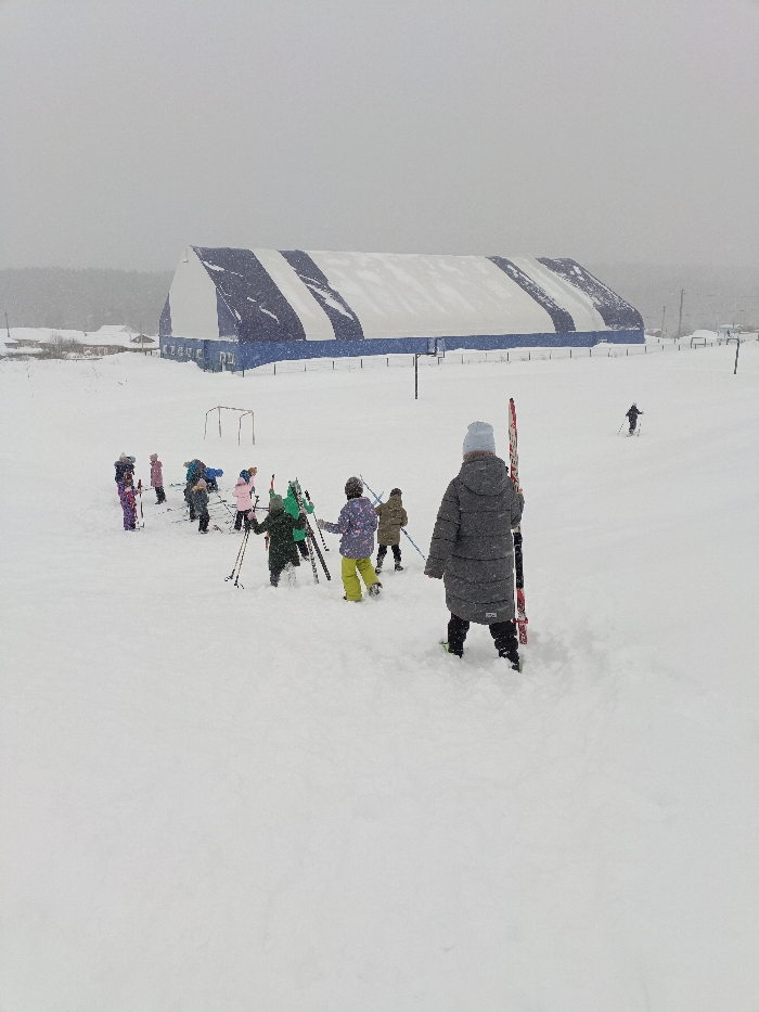 The image depicts an outdoor winter scene in Sarapul, Russia, characterized by extensive snow cover and ongoing light to moderate snowfall under an overcast grey sky. In the mid-ground, a large, elongated building with a distinctive blue and white striped roof is prominent. The roof features approximately five wide, diagonal blue stripes against a white background. The building's lower section is blue with visible rectangular windows. Distant trees and smaller, snow-covered structures are partially visible on the horizon behind this building. In the foreground and mid-ground, a group of approximately ten to twelve individuals, predominantly children, are gathered in a deep, snow-covered field. They are dressed in varied winter attire, including padded jackets, snow pants, and hats of various colors (e.g., grey, dark green, purple, yellow-green, pink, blue, brown). Most individuals are equipped with skis and ski poles. The person in the immediate foreground, viewed from behind, wears a long grey padded coat and a light blue beanie, holding a pair of red skis vertically. This individual stands in deep snow, obscuring their feet. Within the main group, individuals are in various postures, including standing and possibly adjusting equipment, with ski poles planted in the snow. To the left of the main group, a small, metal goalpost frame is partially buried in the snow. Further to the right in the mid-ground, a solitary individual on skis, also equipped with poles, is observed moving away from the main group across the snowy field. The ground is uniformly covered in fresh snow, and visible snowflakes indicate active precipitation.