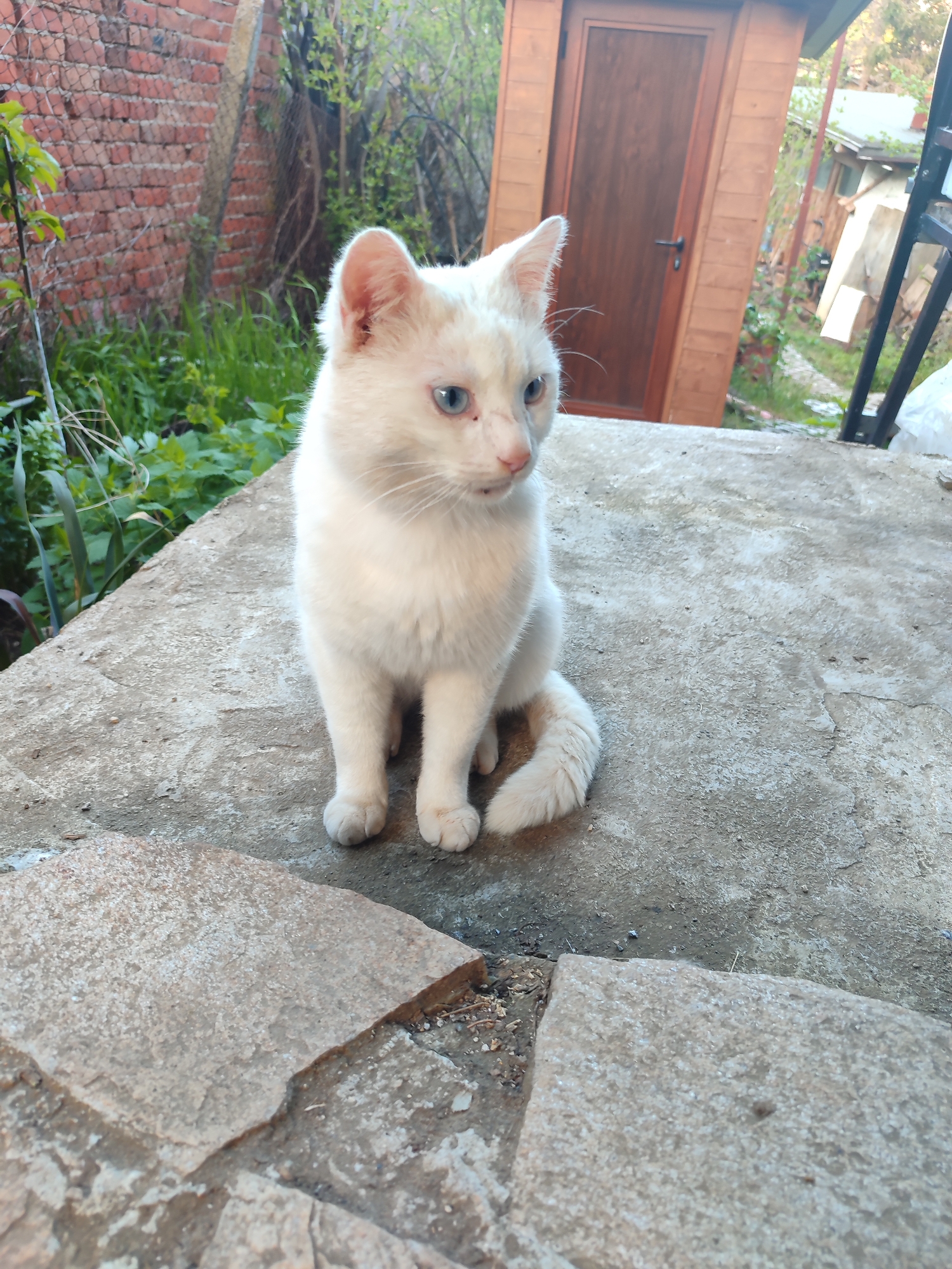 A white cat with blue eyes sits on a weathered, grey stone surface. Behind the cat, there is a brick wall with green vegetation and a small, wooden shed with a dark brown door. The location is Varshilo, Bulgaria.