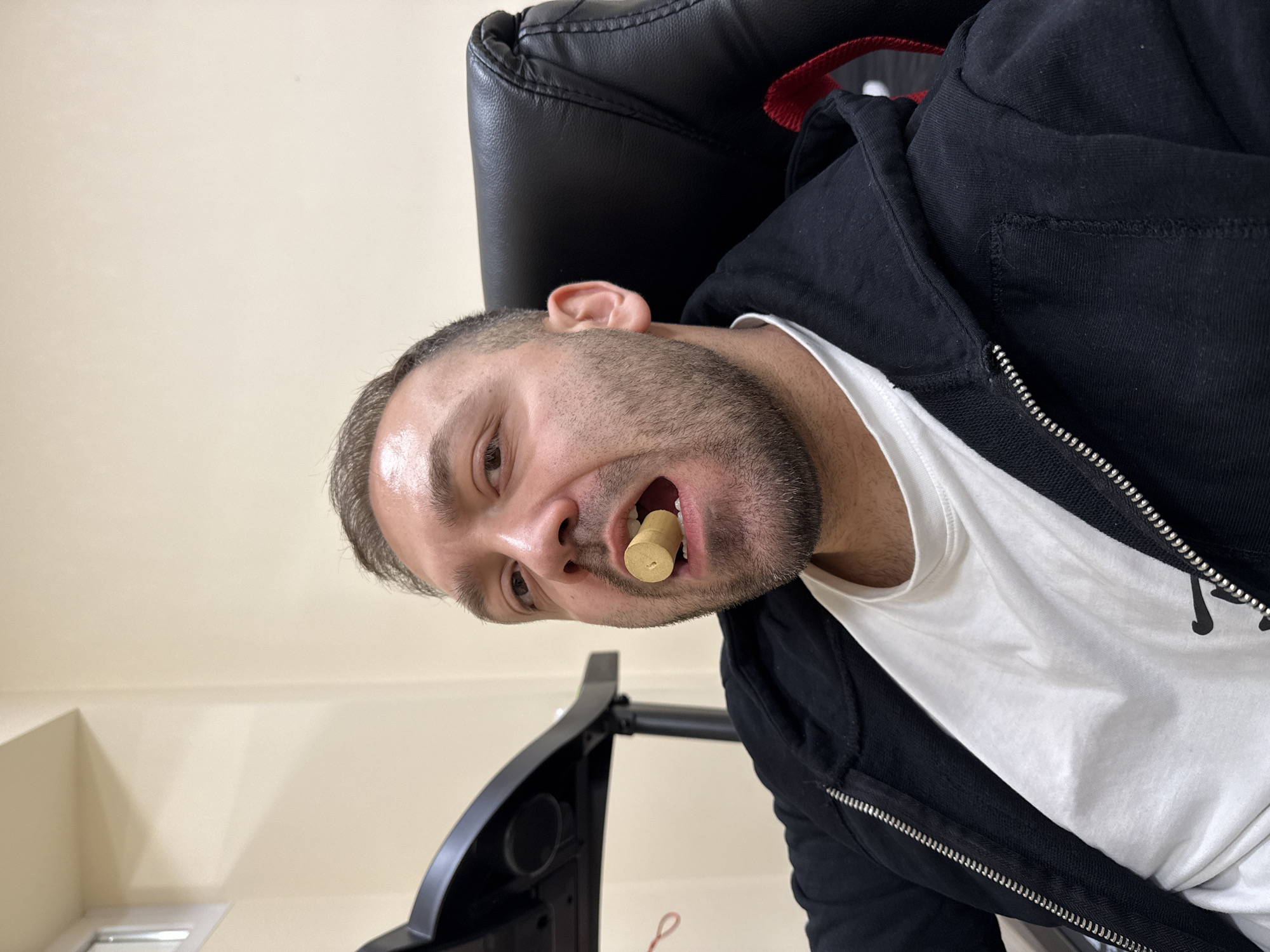 man with short, light brown hair and a beard, sitting in a black office chair against a light beige wall. He is wearing a white t-shirt under a partially zipped-up black hooded sweatshirt. The man has a light-colored cylindrical object, possibly a cork, held between his front teeth. The angle of the image suggests it was taken from a slightly lower perspective. The location in Ruse, Bulgaria is not discernible from the image.