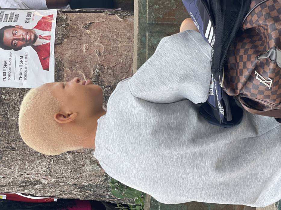 The image captures an outdoor scene in Uturu, Nigeria. In the foreground, a person with light brown skin and very short, bleached blonde hair is shown in right-profile, wearing a plain light gray long-sleeved shirt. The individual displays a subtle smile and looks towards the right. Directly behind the person is a large tree trunk with rough, textured bark. A white poster is affixed to the tree, featuring a headshot of a man in a red suit and tie. Text on the poster advertises "SCHOOL OF LEADERSHIP" and "SCHOOL OF THE SPIRIT" sessions, specifying "TUES || 5PM" and "THURS || 5PM", and includes "ABU UTURU" and "PST KC SIMON". To the right of the person, a brown and dark checkered bag with an "LV" logo is visible, partially covering a dark blue item. A greenish-gray concrete structure forms the base of the tree in the lower right.