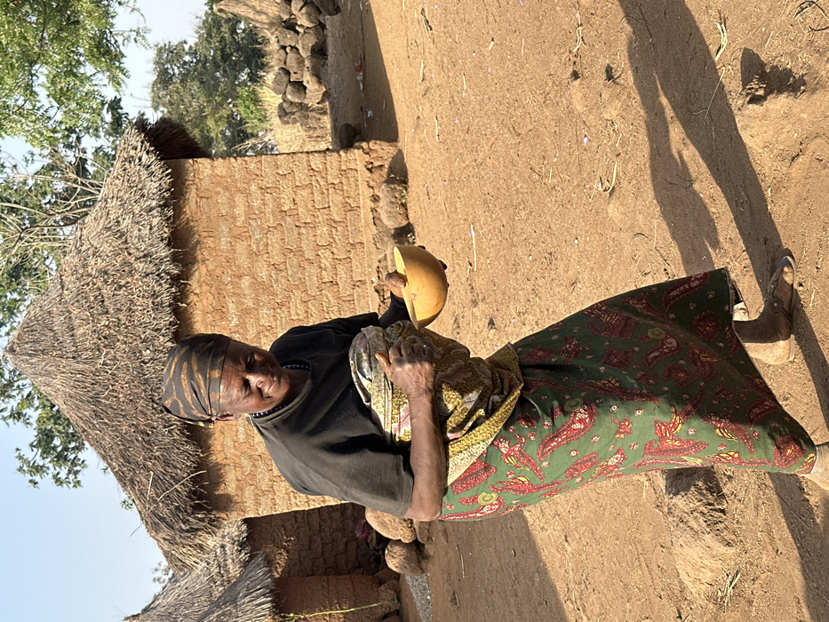 An elderly woman stands in a rural setting, possibly a village, near a thatched-roof building with mud brick walls
