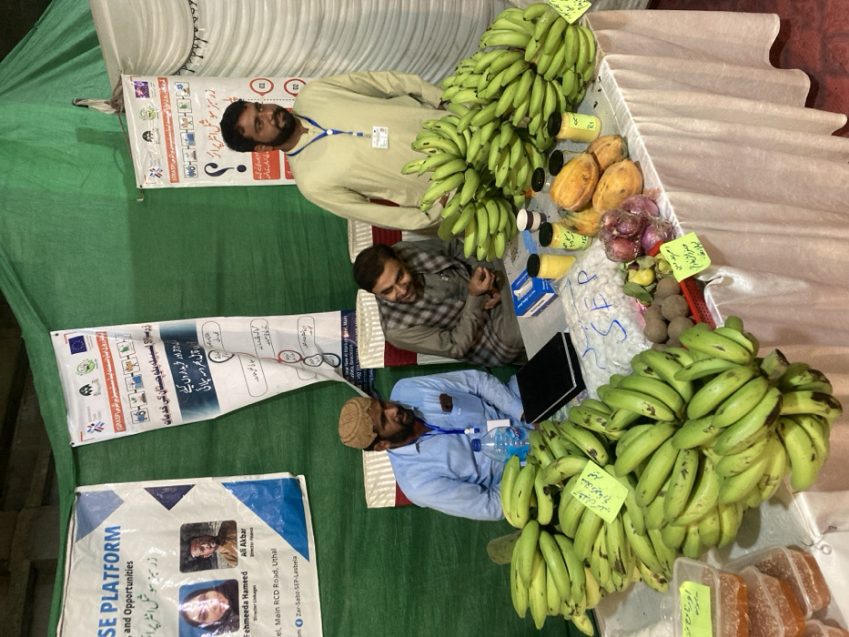 The scene is set indoors in Quetta City Tehsil, Pakistan, likely within an event space or exhibition tent. The background features a green fabric panel to the left and a white fabric partition to the right. Three white banners are displayed; the leftmost banner includes English text "SE PLATFORM and Opportunities," names "Fehmeeda Hameed" and "Ali Akbar" with their titles, and "Zar-Sabz SEP-Lasbela." The other two banners contain Urdu text and logos, with one mentioning "GRASP" and "Zar-Sabz Balochistan ki Khidmat" and the other "Zar Sabz Social Enterprise." In the foreground, a table covered with a white tablecloth presents a display of various agricultural products. Three adult males are positioned behind the table. The man on the far left is seated, wearing a light blue shirt and a brown cap, with a blue lanyard and ID card visible around his neck. He looks towards the man seated next to him. This second man, wearing a grey plaid shirt, is also seated and leans forward, looking downwards and to his right. The third man stands to the right, wearing a light brown shalwar kameez and a blue lanyard with an ID card; he stands upright, looking forward. The table features multiple large bunches of unripe green bananas, some with small yellow price tags displaying Urdu text. A red plastic basket contains brown, round fruits (possibly sapodillas), red onions, and limes, also accompanied by a yellow tag. Several large, yellow-orange papayas are arranged alongside. Other items include numerous clear plastic jars with yellow contents, several clear plastic containers filled with an amber, jelly-like substance, and a clear plastic bag containing white, elongated items, marked "SEP." A plastic water bottle, a blue box of tissues, and a black notebook are also present on the table.