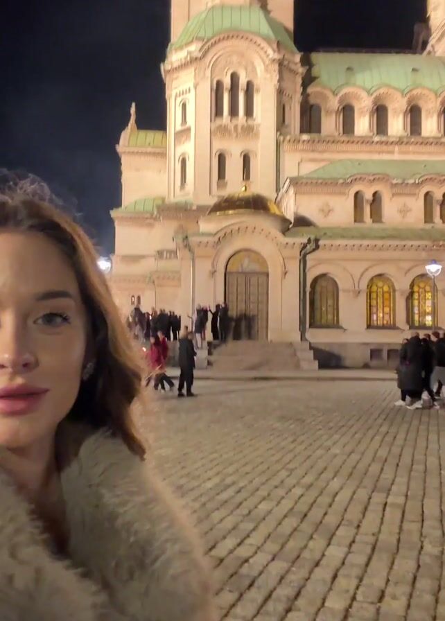 At night, a woman in a fur coat stands in front of a large, brightly lit cathedral with multiple green domes and a gold-topped tower