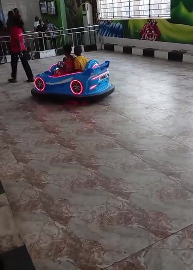 two young children riding in a blue bumper car with neon lights inside an indoor amusement park or play area. They drive around on a marble-like tile floor. The perimeter has black and white painted bumpers. The background features colorful cartoon murals on the walls. Other people are standing around watching. Music is playing.