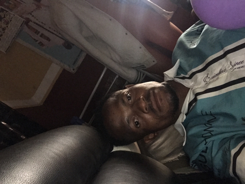 The image displays an adult male from the chest up, positioned in a reclining posture. He has dark skin, short dark hair, and a short beard or stubble. He is wearing a short-sleeved polo shirt with a white collar, featuring alternating light blue-green and white vertical stripes. Text visible on the shirt includes "SULYADONE" on the left side and "Enriched Since" on a central white stripe. The subject is looking directly into the camera. To his immediate left, a large, dark, textured upholstered surface, consistent with a seat or headrest, occupies a significant portion of the frame. In the upper right background, a pale fabric item with horizontal stripes is visible, draped over an unseen object. A purple spherical object, possibly a balloon, is partially visible in the lower right foreground. The background elements suggest an indoor or vehicle interior setting with various structural components and surfaces. The depicted location is Oba-Ile, Nigeria.