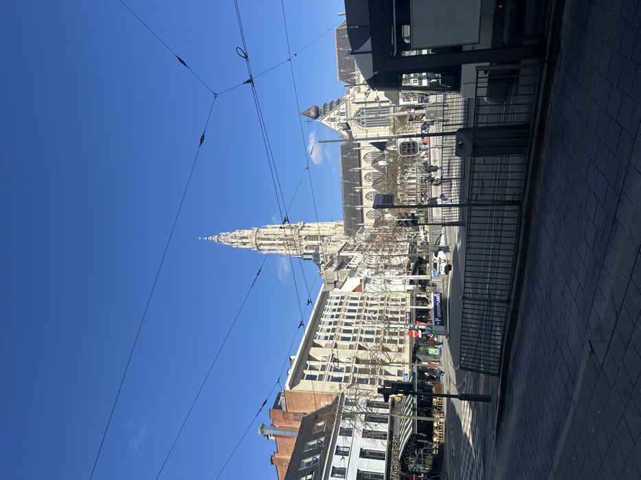 This image displays an urban street and square scene on Groenplaats in Antwerp, Belgium