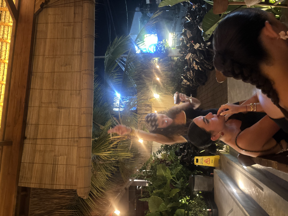 This image depicts a nighttime scene at an outdoor or semi-outdoor establishment in Uluwatu, Indonesia, likely a restaurant or bar. Overhead, a thatched roof structure is visible, with a rolled-up bamboo blind extending across the top of the frame. Below this, a string of warm-toned bulb lights provides ambient illumination. In the mid-ground, a woman with long, dark curly hair, wearing a dark top and a patterned headscarf, stands with her right arm raised, fingers extended. She holds a dark-colored drink in a glass with her left hand. Numerous bracelets adorn both of her wrists. She appears in motion, possibly dancing or making a gesture. To her left and slightly in front, another woman is seated, facing left in profile. She wears a black, sleeveless dress, with her dark hair pulled back. She has earrings and several gold-toned bracelets on her left wrist. Her right hand is near her chin or mouth, and she appears contemplative or attentive. In the immediate foreground on the right, the back of a third person's head and shoulders are visible, showing braided dark hair and a light-colored earring. This person is also seated. The background reveals lush green foliage, including palm trees, with more string lights dispersed among them. Beyond the foliage, a parking area with numerous parked motorcycles or scooters is visible. A bright blue light source, possibly a large screen or illuminated sign, glows in the distance. To the left, a yellow "CAUTION WET FLOOR" sign stands on a paved surface next to a series of concrete steps that have integrated strip lighting. The overall environment suggests a lively, relaxed evening atmosphere.