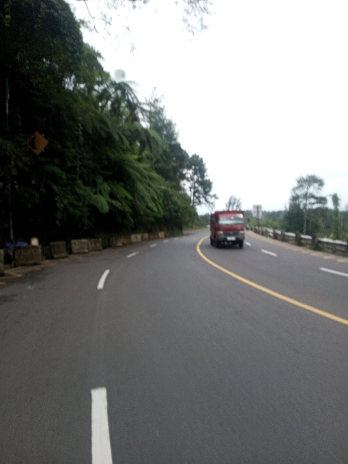 The image displays a curved asphalt road located in Gubbisamamidi, India, under an overcast sky. The road features a dashed white line along its left edge and a continuous yellow line marking the center or a no-passing zone, separating two visible lanes. A red box truck is observed in the distance on the right side of the road, moving away from the viewpoint. Along the left side of the road, a series of light-colored concrete barriers separate the roadway from a dense, vegetated embankment comprising trees and large ferns. A yellow diamond-shaped road sign is partially visible within this foliage. On the right side of the road, a metal guardrail runs parallel to the curvature, with trees and distant vegetation visible beyond. No individuals are discernible within the frame.