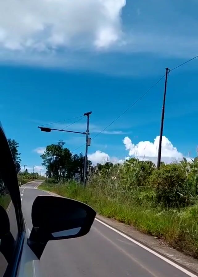 car driving along a winding road under a bright blue sky with scattered white clouds. The camera is positioned inside the car, showing the side mirror. The road is asphalt with a white line marking the edge. Vegetation, including tall grass and bushes, lines the side of the road. Utility poles and power lines are visible. A sign is present next to the road, but the details are obscured. A motorcycle can be seen in the distance ahead on the road. The sound of wind is prominent.