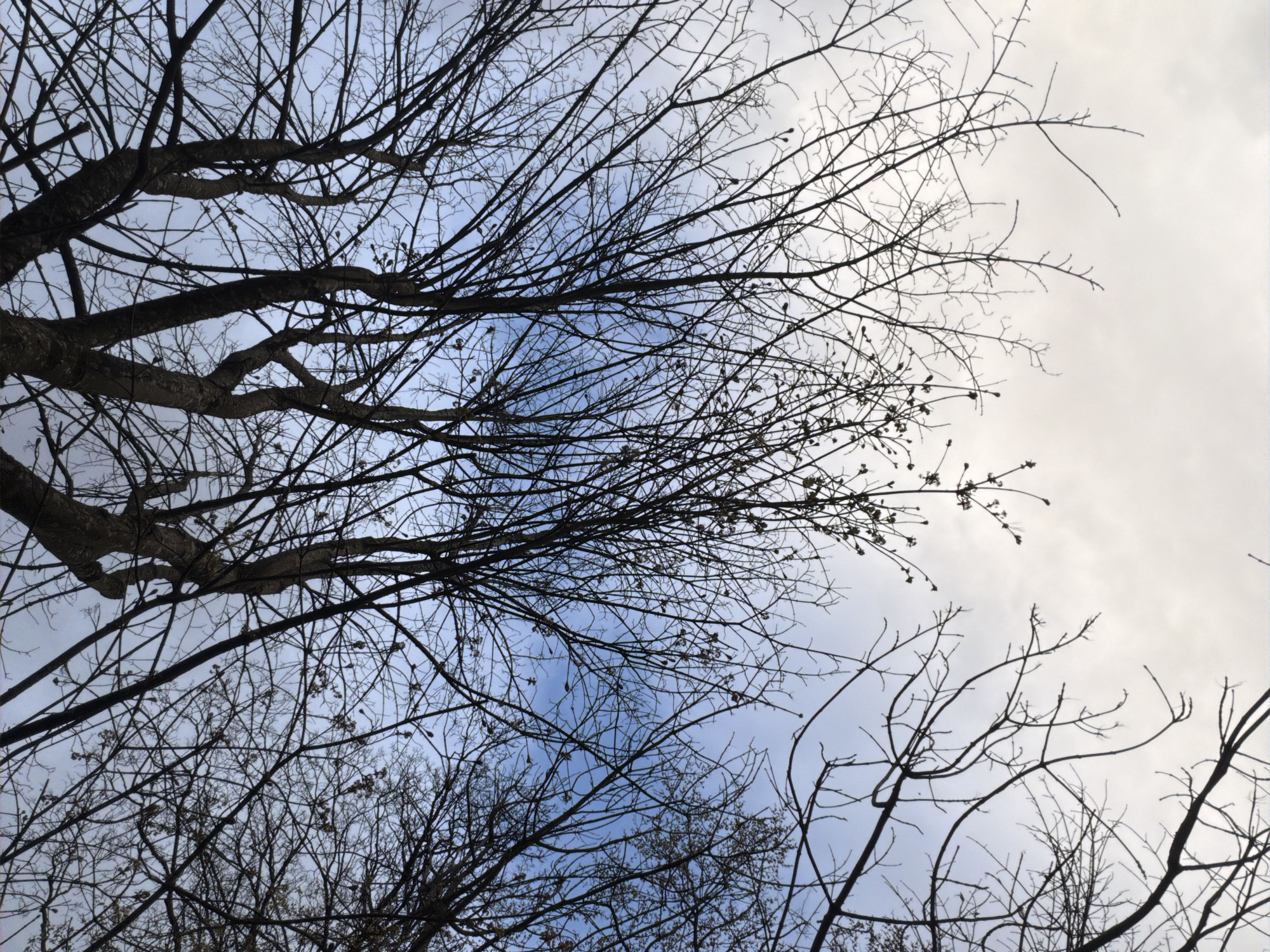 The image displays an upward view through a dense network of leafless tree branches, silhouetted against a varied sky. The upper left quadrant of the sky is a light blue, transitioning to an overcast white and light grey across the central and lower portions of the frame. The branches are primarily bare, indicative of a dormant season, though some exhibit small, dark, undeveloped buds or seed pods. No individuals, animals, or man-made structures are present. The location is Unknown, Unknown.