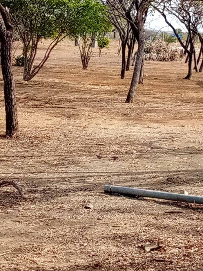 The scene depicts an outdoor environment in Las Guevaras, Venezuela, characterized by dry, light brown earth strewn with scattered organic debris. Numerous trees with dark brown trunks and branches are distributed throughout the frame; some in the midground exhibit green foliage, while others appear largely bare. Tree shadows are cast across the ground, indicating daylight conditions. In the lower right foreground, a dark grey cylindrical pipe, approximately one meter in length, lies horizontally on the ground; one end features a cap with a small metallic ring. In the background, to the right of the frame's center, a substantial pile of cut wood or branches is visible. No individuals or active interactions are present.