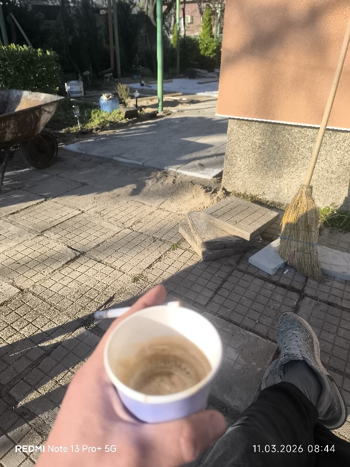 The image portrays an outdoor scene in Dolni Dabnik, Bulgaria, captured on March 11, 2026, at 08:44 from the perspective of an individual resting. In the immediate foreground, a left hand holds a light-colored disposable cup containing a beverage with a foamy surface, while a lit cigarette is held between the same fingers. To the right, a foot wearing a grey athletic shoe and a grey sock is visible, positioned on a paved surface. The ground is primarily covered with square concrete paving slabs, some of which are laid, and others are partially surrounded by sand or loose earth. A stack of four identical square concrete paving slabs is positioned on the ground to the right, adjacent to a building. A straw broom with a wooden handle leans against the lower section of this building wall, which features a rough, light grey foundation transitioning to a terracotta-colored upper facade. In the mid-ground, beyond the initially paved area, an unpaved section of earth and sand is visible, leading to further laid paving stones. To the far left, a rusty wheelbarrow is present. The background reveals various construction-related objects, including a white bucket and a blue drum, amidst dense green vegetation, trees, and a light green vertical metal pole. Daylight illuminates the scene, casting discernible shadows. The image metadata indicates it was captured using a "REDMI Note 13 Pro+ 5G."